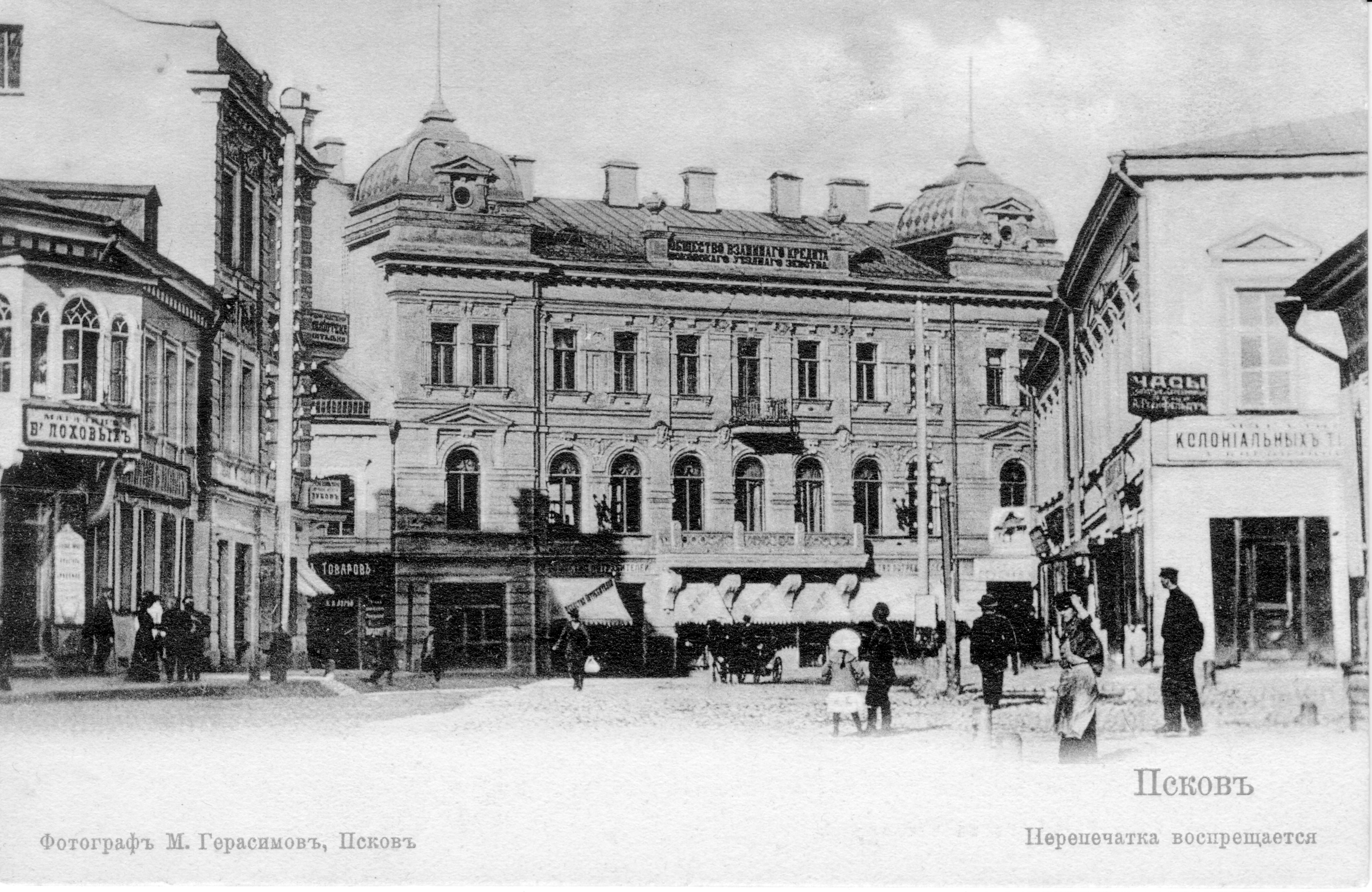 Это здание было построено в 1902 году по заказу и на средства Общества взаимного кредита Псковского уездного земства. Являясь одним из лучших архитектурных произведений периода эклектики начала XX века в Пскове, здание имеет статус памятника архитектуры регионального значения. Проект здания был подготовлен инженером губернской строительной комиссии Герардом Фортунатовичем Станкевичем. Разработанная им система архитектурного декора здания хорошо выражает сюжетно-пластическими средствами основную идею финансового учреждения и создает впечатление солидности и надежности владельцев.